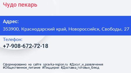 Чудо пекарь по адресу 353900, Краснодарский край, Новороссийск, Свободы, 27 в дальнейшем Организация, размещена в следующих категориях: