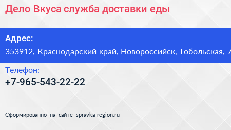 Дело Вкуса, служба доставки еды по адресу 353912, Краснодарский край, Новороссийск, Тобольская, 7 в дальнейшем Организация, размещена в следующих категориях: