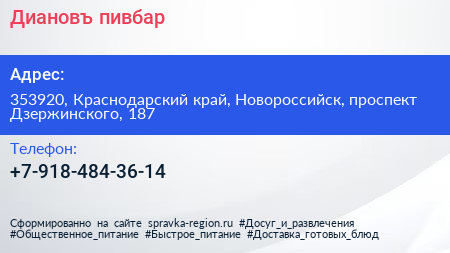 Диановъ, пивбар по адресу 353920, Краснодарский край, Новороссийск, проспект Дзержинского, 187 в дальнейшем Организация, размещена в следующих категориях: