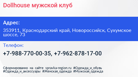 Dollhouse, мужской клуб по адресу 353911, Краснодарский край, Новороссийск, Сухумское шоссе, 73 в дальнейшем Организация, размещена в следующих категориях: