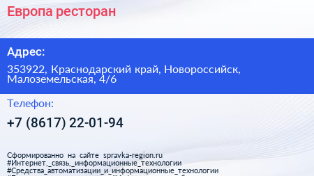 Европа, ресторан по адресу 353922, Краснодарский край, Новороссийск, Малоземельская, 4/6 в дальнейшем Организация, размещена в следующих категориях: