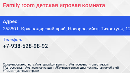 Family room, детская игровая комната по адресу 353901, Краснодарский край, Новороссийск, Тихоступа, 12 в дальнейшем Организация, размещена в следующих категориях:
