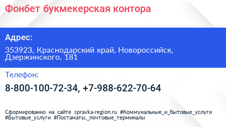 Фонбет, букмекерская контора по адресу 353923, Краснодарский край, Новороссийск, Дзержинского, 181 в дальнейшем Организация, размещена в следующих категориях: