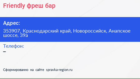 Friendly, фреш-бар по адресу 353907, Краснодарский край, Новороссийск, Анапское шоссе, 39а в дальнейшем Организация, размещена в следующих категориях: