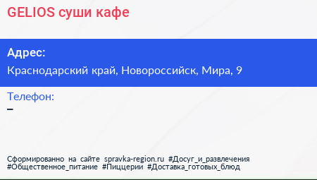 GELIOS, суши-кафе по адресу Краснодарский край, Новороссийск, Мира, 9 в дальнейшем Организация, размещена в следующих категориях: