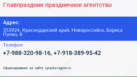 Главпраздник, праздничное агентство по адресу 353924, Краснодарский край, Новороссийск, Бориса Пупко, 8 в дальнейшем Организация, размещена в следующих категориях: