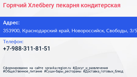 Горячий Хлебbery, пекарня-кондитерская по адресу 353900, Краснодарский край, Новороссийск, Свободы, 3/5 в дальнейшем Организация, размещена в следующих категориях: