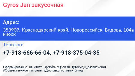 Gyros Jan, закусочная по адресу 353907, Краснодарский край, Новороссийск, Видова, 104а киоск в дальнейшем Организация, размещена в следующих категориях: