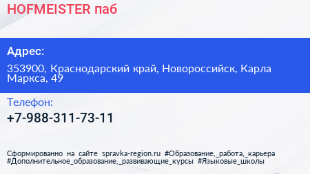 HOFMEISTER, паб по адресу 353900, Краснодарский край, Новороссийск, Карла Маркса, 49 в дальнейшем Организация, размещена в следующих категориях: