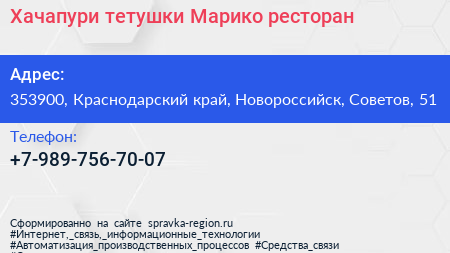 Хачапури тетушки Марико, ресторан по адресу 353900, Краснодарский край, Новороссийск, Советов, 51 в дальнейшем Организация, размещена в следующих категориях: