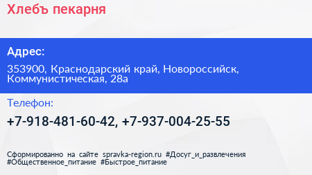 Хлебъ, пекарня по адресу 353900, Краснодарский край, Новороссийск, Коммунистическая, 28а в дальнейшем Организация, размещена в следующих категориях: