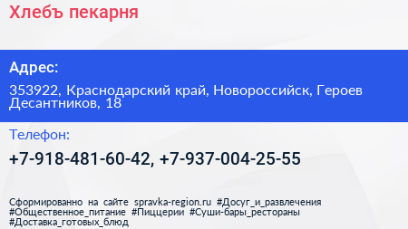 Хлебъ, пекарня по адресу 353922, Краснодарский край, Новороссийск, Героев Десантников, 18 в дальнейшем Организация, размещена в следующих категориях: