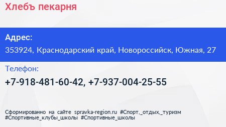 Хлебъ, пекарня по адресу 353924, Краснодарский край, Новороссийск, Южная, 27 в дальнейшем Организация, размещена в следующих категориях: