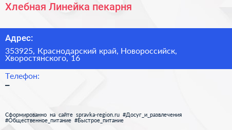 Хлебная Линейка, пекарня по адресу 353925, Краснодарский край, Новороссийск, Хворостянского, 16 в дальнейшем Организация, размещена в следующих категориях: