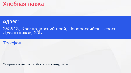 Хлебная лавка по адресу 353913, Краснодарский край, Новороссийск, Героев Десантников, 33Б в дальнейшем Организация, размещена в следующих категориях: