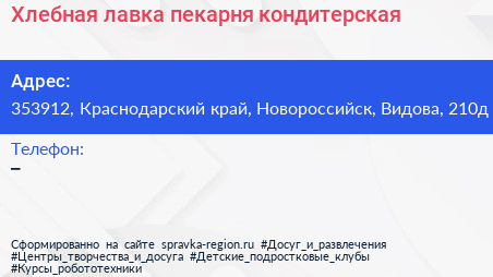 Хлебная лавка, пекарня-кондитерская по адресу 353912, Краснодарский край, Новороссийск, Видова, 210д в дальнейшем Организация, размещена в следующих категориях: