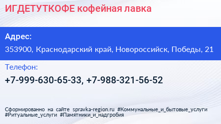 ИГДЕТУТКОФЕ?, кофейная лавка по адресу 353900, Краснодарский край, Новороссийск, Победы, 21 в дальнейшем Организация, размещена в следующих категориях: