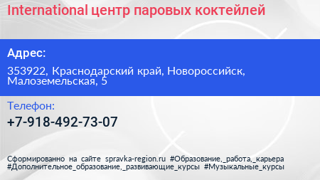 International, центр паровых коктейлей по адресу 353922, Краснодарский край, Новороссийск, Малоземельская, 5 в дальнейшем Организация, размещена в следующих категориях: