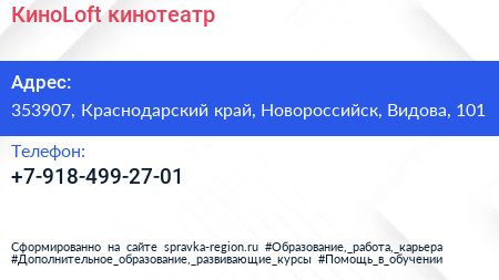 КиноLoft, кинотеатр по адресу 353907, Краснодарский край, Новороссийск, Видова, 101 в дальнейшем Организация, размещена в следующих категориях: