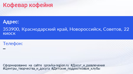 Кофевар, кофейня по адресу 353900, Краснодарский край, Новороссийск, Советов, 22 киоск в дальнейшем Организация, размещена в следующих категориях: