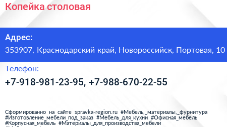 Копейка, столовая по адресу 353907, Краснодарский край, Новороссийск, Портовая, 10 в дальнейшем Организация, размещена в следующих категориях: