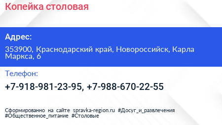 Копейка, столовая по адресу 353900, Краснодарский край, Новороссийск, Карла Маркса, 6 в дальнейшем Организация, размещена в следующих категориях: