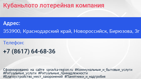 Кубаньлото, лотерейная компания по адресу 353900, Краснодарский край, Новороссийск, Бирюзова, 3г в дальнейшем Организация, размещена в следующих категориях: