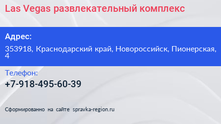 Las Vegas, развлекательный комплекс по адресу 353918, Краснодарский край, Новороссийск, Пионерская, 4 в дальнейшем Организация, размещена в следующих категориях: