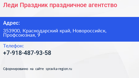 Леди Праздник, праздничное агентство по адресу 353900, Краснодарский край, Новороссийск, Профсоюзная, 9 в дальнейшем Организация, размещена в следующих категориях: