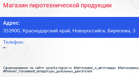 Магазин пиротехнической продукции по адресу 353900, Краснодарский край, Новороссийск, Бирюзова, 3 в дальнейшем Организация, размещена в следующих категориях: