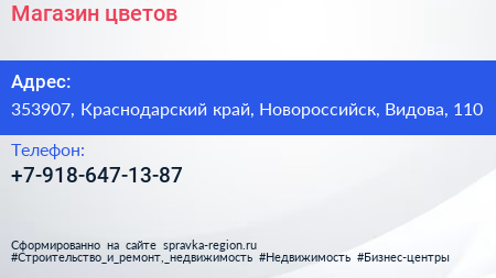 Магазин цветов по адресу 353907, Краснодарский край, Новороссийск, Видова, 110 в дальнейшем Организация, размещена в следующих категориях: