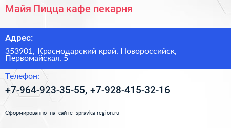 Майя Пицца, кафе-пекарня по адресу 353901, Краснодарский край, Новороссийск, Первомайская, 5 в дальнейшем Организация, размещена в следующих категориях: