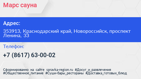 Марс, сауна по адресу 353913, Краснодарский край, Новороссийск, проспект Ленина, 33 в дальнейшем Организация, размещена в следующих категориях: