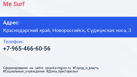 Me & Surf по адресу Краснодарский край, Новороссийск, Суджукская коса, 3 в дальнейшем Организация, размещена в следующих категориях: