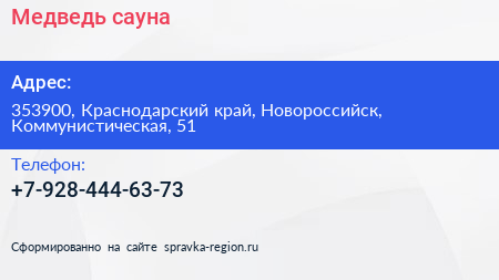 Медведь, сауна по адресу 353900, Краснодарский край, Новороссийск, Коммунистическая, 51 в дальнейшем Организация, размещена в следующих категориях: