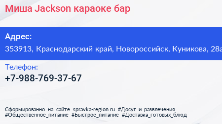 Миша Jackson, караоке-бар по адресу 353913, Краснодарский край, Новороссийск, Куникова, 28а в дальнейшем Организация, размещена в следующих категориях: