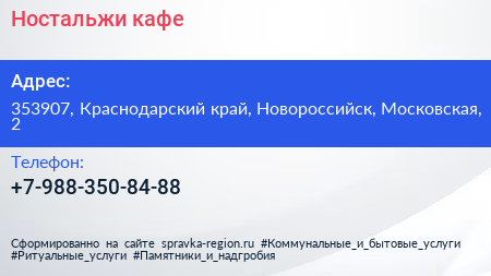 Ностальжи, кафе по адресу 353907, Краснодарский край, Новороссийск, Московская, 2 в дальнейшем Организация, размещена в следующих категориях:
