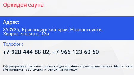 Орхидея, сауна по адресу 353925, Краснодарский край, Новороссийск, Хворостянского, 13а в дальнейшем Организация, размещена в следующих категориях: