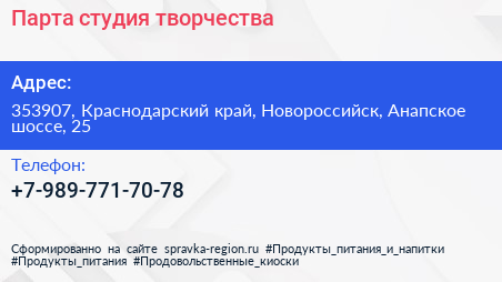 Парта, студия творчества по адресу 353907, Краснодарский край, Новороссийск, Анапское шоссе, 25 в дальнейшем Организация, размещена в следующих категориях: