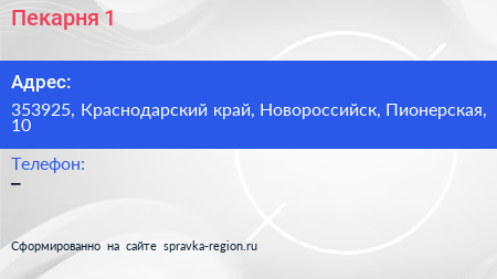 Пекарня №1 по адресу 353925, Краснодарский край, Новороссийск, Пионерская, 10 в дальнейшем Организация, размещена в следующих категориях: