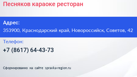 Песняков, караоке-ресторан по адресу 353900, Краснодарский край, Новороссийск, Советов, 42 в дальнейшем Организация, размещена в следующих категориях:
