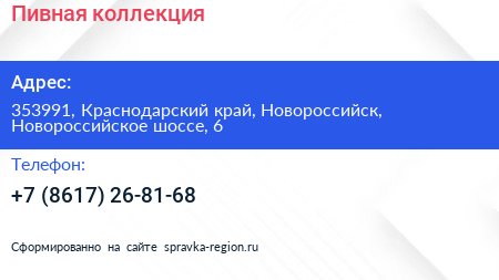 Пивная коллекция по адресу 353991, Краснодарский край, Новороссийск, Новороссийское шоссе, 6 в дальнейшем Организация, размещена в следующих категориях: