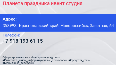 Планета праздника, ивент-студия по адресу 353993, Краснодарский край, Новороссийск, Заветная, 64 в дальнейшем Организация, размещена в следующих категориях: