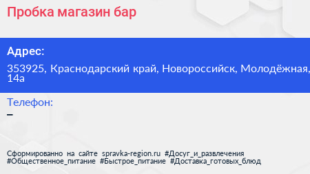 Пробка, магазин-бар по адресу 353925, Краснодарский край, Новороссийск, Молодёжная, 14а в дальнейшем Организация, размещена в следующих категориях: