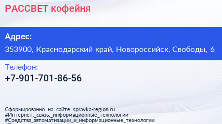 РАССВЕТ, кофейня по адресу 353900, Краснодарский край, Новороссийск, Свободы, 6 в дальнейшем Организация, размещена в следующих категориях:
