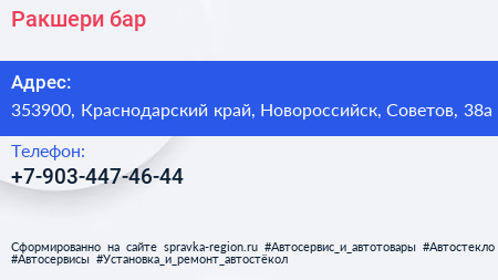 Ракшери, бар по адресу 353900, Краснодарский край, Новороссийск, Советов, 38а в дальнейшем Организация, размещена в следующих категориях:
