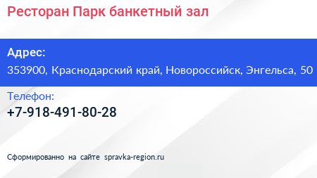 Ресторан Парк, банкетный зал по адресу 353900, Краснодарский край, Новороссийск, Энгельса, 50 в дальнейшем Организация, размещена в следующих категориях: