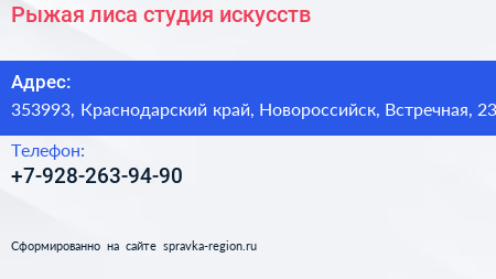 Рыжая лиса, студия искусств по адресу 353993, Краснодарский край, Новороссийск, Встречная, 23 в дальнейшем Организация, размещена в следующих категориях: