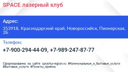 SPACE, лазерный клуб по адресу 353918, Краснодарский край, Новороссийск, Пионерская, 2Б в дальнейшем Организация, размещена в следующих категориях: