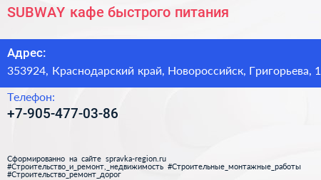 SUBWAY, кафе быстрого питания по адресу 353924, Краснодарский край, Новороссийск, Григорьева, 1 в дальнейшем Организация, размещена в следующих категориях: